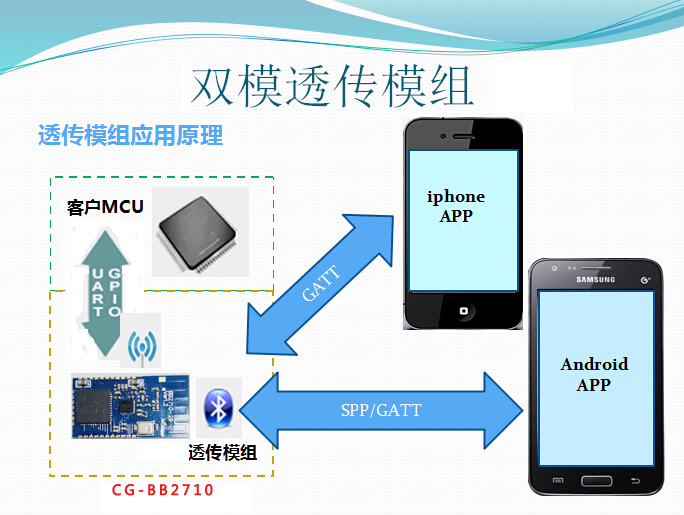 CG-BB2710双模蓝牙模块,是我司最新推出的支持蓝牙4.0标准协议的双模(Dual-Mode)蓝牙模组,该模组基于蓝牙领先芯片供应商Broadcom公司的HCI芯片与MCU芯片架构,支持Bluetooth3.0,Bluetooth3.0+EDR,以及最新Bluetooth4.0 BLE协议规范。即可同时应用于苹果的IOS系统以及Android系统作为通讯模块使用。